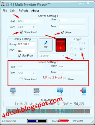 Tunnel Newbie Phreak Maksimal Login 10 SSH Dengan 2 Server, 1 server maksimal 5 SSH dan apabila Login dengan 2 server Anda bisa HyperLogin sampai 10 SSH. Alat Tunneling buat akses SSH dengan mudah, tentunya juga mudah di gunakan serta terdapat banyak fitur-fitur spesial terbaru dalam Tunnel ini.